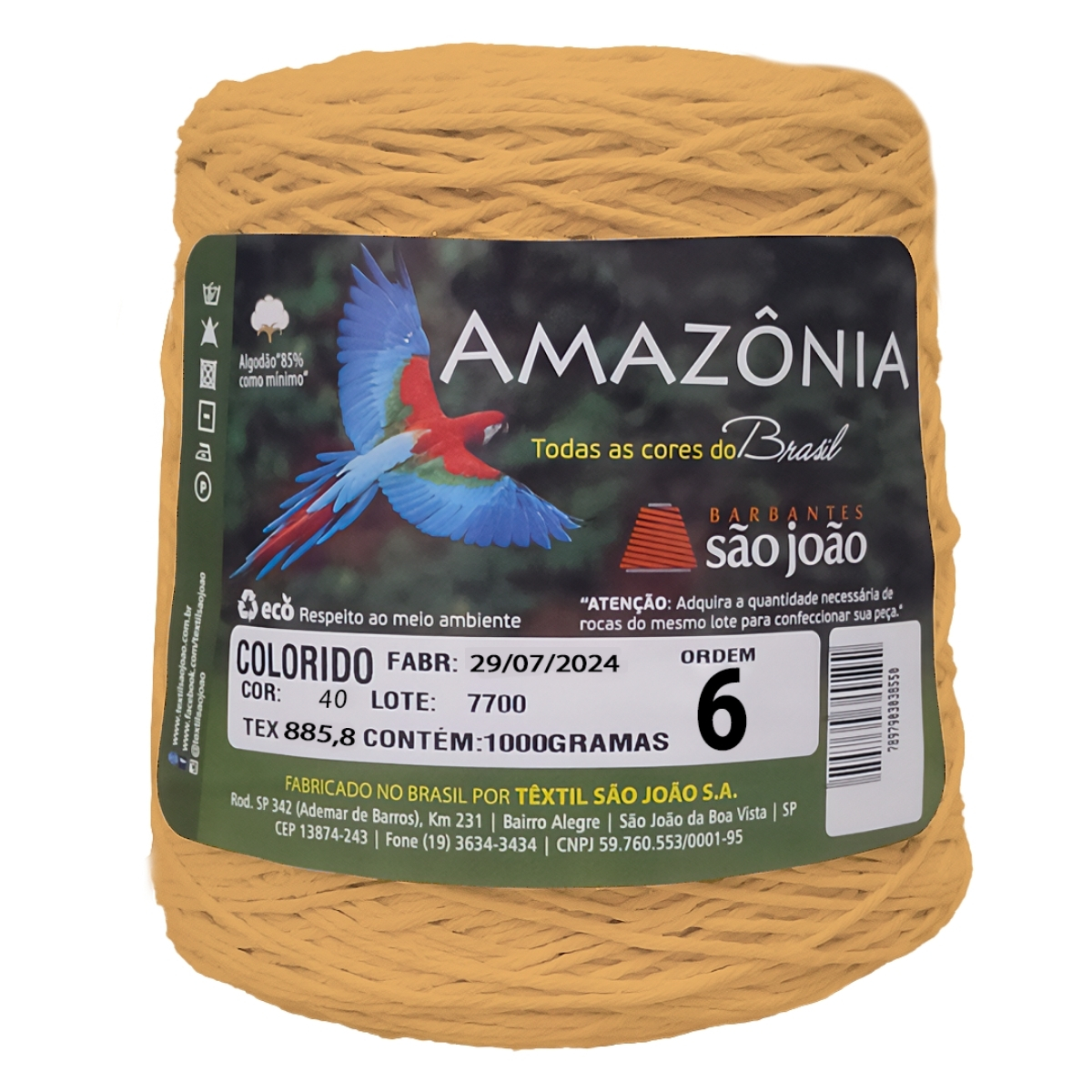 Barbante Amazônia Fio 6 com 400g, ideal para crochê, tricô e artesanato criativo. Desenvolvido com 85% de algodão reciclado, proporciona acabamento uniforme e toque suave. Cores firmes, ótimo rendimento e qualidade São João.