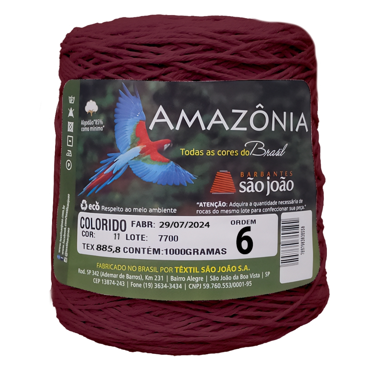 Barbante Amazônia Fio 6 com 400g, ideal para crochê, tricô e artesanato criativo. Desenvolvido com 85% de algodão reciclado, proporciona acabamento uniforme e toque suave. Cores firmes, ótimo rendimento e qualidade São João.